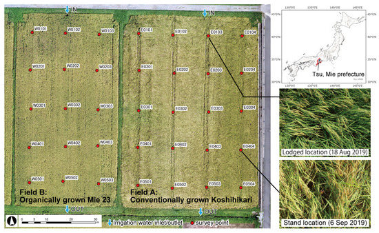 We surveyed two adjacent paddy fields at Tsuji Farm (34°46′ N, 136°29′ E) in Tsu, Mie Prefecture, Japan, as shown in Figure 1. The mean annual temperature for the past 10 years in this area was 16.5 °C, and the mean annual precipitation was 1687 mm [31]. The main study field was Field A, with an area of 55 × 80 m, where Koshihikari was conventionally grown. Field B, with an area of 40 × 80 m, where Mie 23 was organically grown, was an additional study field to develop the SAN estimating equation. Irrigation water inlets and outlets were located at the northern and southern ends, respectively, as indicated by the blue arrows in Figure 1. The research period was from March to September 2019. The mean annual temperature and annual precipitation in 2019 were 16.9 °C and 1630 mm, which were the same level as in a normal year. In Field A, 2400 kg ha−1 of rice bran was applied as organic material in the winter, and 250 kg ha−1 (70 kg N ha−1) of one-shot basal chemical fertilizer “M cote 2877” was applied in May 2019. M cote 2877 was loaded on a transplanter and applied evenly at the same time as the Koshihikari was planted. In Field B, 1000 kg ha−1 of rice bran was applied similarly to Field A, and 900 kg ha−1 (63 kg N ha−1) of soybean waste was applied as the basal fertilizer in May 2019. Beginning in mid-August, Koshihikari started to lodge on the north side of Field A.