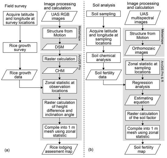 Flowchart of (a) rice lodging assessment and (b) soil fertility estimation. UAS: unmanned aircraft system; DSM: digital surface model; CHM: canopy height model.