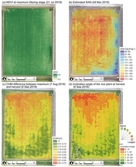 Comparison between (a) rice growth status assessed by the NDVI, (b) estimated SAN distribution, and (c,d) lodging severity. NDVI: normalized difference vegetation index; SAN: available nitrogen in soil; CHM: canopy height model.