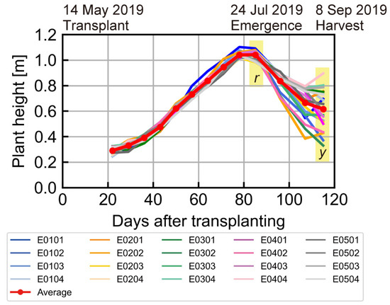 Variation in rice plant height during the research period (June–September 2019). r: maximum plant height; y: harvest plant height.