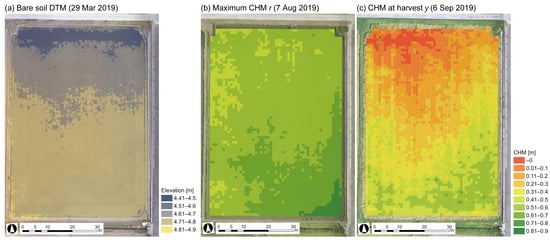 (a) Bare soil DTM, (b,c) calculated maximum plant height and harvest plant height using DSM. DTM: digital terrain model.