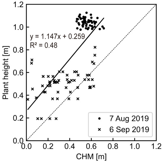 Figure 6 compares the measured plant height to the CHM at each survey location. Overall, CHM tended to underestimate plant height by approximately −0.26 m. Wilke et al. [44] reported that UAS CHM was underestimated by 0.01–0.29 m in barley test plots. These deviations were larger in the low-sowing-density plots due to detection of the soil surface. Tanaka and Kondoh [20] added 0.2 m to the CHM values as a correction coefficient to transform plant length when they assessed a potential risk map of rice lodging using plant length. In this study, we applied the calculated CHM to Equations (2) and (3) without correction because the same deviation value was added to y and r in Equation (2). The difference in the inclination angle was estimated to be about −5° in Equation (3), and it had less impact on the assessment, as rice lodging was evaluated at six levels in 18° increments (Figure 3d); that is, zero for no lodging to five for completely lodged [10].