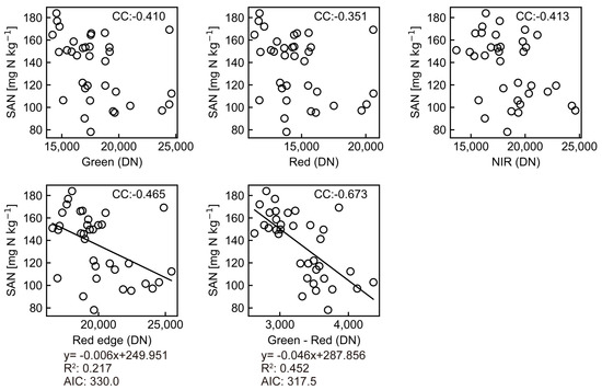 As shown in Figure 7, the correlation coefficient between Red edge and SAN was −0.46 in the single band, and the green–red spectral index had the highest correlation coefficient of −0.67. Therefore, we attempted a regression analysis of SAN using green–red as the explanatory variable and obtained the best estimate equation with a coefficient of determination of 0.45 (Figure 7).