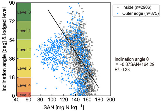 The blue mark in Figure 8 was the mesh included in the 4 m outer edge of the field (n = 875). Many of these data differed in trend from inside meshes data and were excluded when analyzing the correlation between rice inclination angle and SAN. The rice plants in these meshes were observed to be lodged regardless of the SAN content. The degree of lodging was affected by overlapping applications of basal fertilizer because the transplanter moved back and forth in this area.