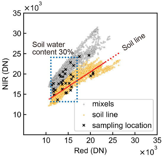 The orange group was classified as the “soil line,” which did not contain vegetation in the pixels. The gray group showed higher NIR values, which seemed to contain vegetation, such as rice plant residues. These residues caused mixed pixels (mixels) of soil and vegetation on the UAS images and made it difficult to separate the soil pixels. Additionally, the x mark indicates the DN of the soil sampling locations, and its distribution was clustered at lower values. Wet soil has lower NIR and red reflectance, whereas dried soil has higher values [32]. The mean soil water content in the samples was 31.1% (Table 1), which suppressed soil reflectance. These bare soil conditions resulted in low accuracy of the SAN estimating equation. To overcome these issues, we suggest the following measures: