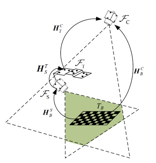 The common field-of-view calibration method (CFVCM) is shown in Figure 2. A chessboard target TB is placed within the overlapped visual field of two cameras. The featured target on the handheld device is also located in the visual field of the fixed camera. Then, the transformation matrix from the sensor camera to the featured target can be expressed by