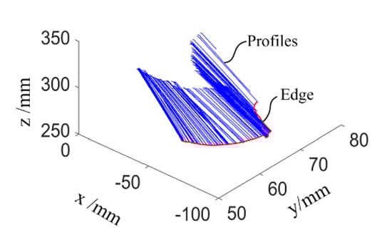 With this calibration method, a plane with a size of 60 × 60 mm is scanned, and the measurement point cloud is shown in Figure 3. The result is totally different from what we expected. Although all the intersection profiles are straight lines, they align in a disordered manner. The edge of the plane should also be a straight line. Now, it becomes an irregular space curve.