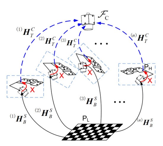 To improve the calibration accuracy of , an improved multi-view calibration method (MVCM) is proposed, as shown in Figure 4. For easy illustration, is represented by X. (n) stands for the posture of the featured target at the nth view of the handheld device; (n) is the posture of the handheld camera that is computed via the chessboard underneath.