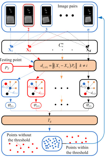 The selected image pairs are obtained by counting the number of the occurrence results that are within the threshold value. A more accurate calibration result of X can be achieved by a recalculation process using the selected image pairs. Assuming is the ith point in C that is calculated by use of Xi, the relative distances between this point and the rest of the points are denoted by Di = {d(i,1), d(i,2), …, d(i,k),…, d(i,b)}, b = Cnm− 1. The interclass variance of d(i,k) within the data set of Di can be calculated by