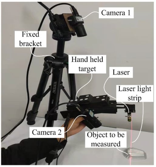 Compared with the motional-axes-based line-structured-light measurement systems (LSLMS), the handheld measuring devices are more flexible. The objects can be scanned from different viewpoints to ensure measurement integrity [14,15,16], although the accuracy of the result highly relies on the data fusion techniques and has the problem of unsmooth edges [17,18]. Data fusion via marker points can lead to a higher accuracy and has been widely adopted by the commercial handheld scanners [19]. Users need to adhere a sufficient number of highly reflective marker points onto the object; this is inconvenient. Another choice is to obtain the posture of the handheld device by use of an inertial measurement unit (IMU) [20,21]. The posture and the acceleration data from the IMU are greatly affected by external forces, vibrations and environments. It is difficult to achieve a high-precision measurement result with commercial IMU components.