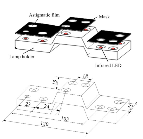 The featured target on the handheld device is also important to ensure measurement accuracy. The composition and key parameters of the target are shown in Figure 7. The light spot of the target was asymmetrically arranged to facilitate the sorting of spots. Independent infrared LEDs illuminated each spot with a wavelength of 850 nm. One side of the mask was coated with a light scattering layer, and the other side was processed with a circular hole corresponding to the lamp position to ensure the clarity of the feature points. The lamp holder was fabricated using a 3D printing technique. The position accuracy of the dots could not fulfill the measurement requirements. Therefore, a binocular method was used to recalibrate the relative distances between the feature points. The calibrated results were used for the computation of the extrinsic parameters.