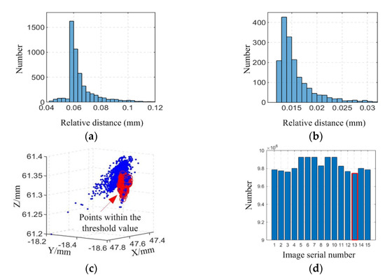 Figure 8a,b represent the relative distances of the distribution point cloud after transformation. Figure 8c represents the distribution of point clouds before and after selection. Figure 8d represents the frequency of specific image pairs that are used for the computation of selected points. These points are within the threshold value of Tg. The image pair that has the least frequency is rejected for this iteration.
