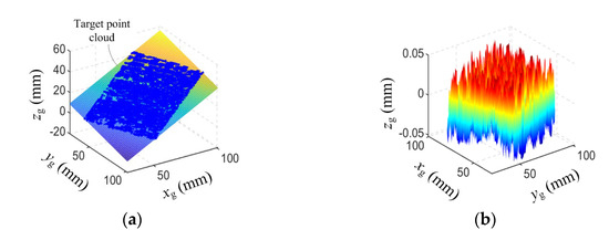 The plane has already been measured using the system that is calibrated by use of the CFVCM. It is a failure result, as shown in Figure 3. After calibration with the improved MVCM, the same plane is rescanned using the handheld LSLMS. The point cloud and the fitted plane are shown in Figure 9a. Nearly all of the points are located on the fitted plane and the edge of the point cloud now becomes straight. Some points are located under the fitted plane due to the least squares fitting criterion and cannot be seen. This is why some holes existed in the measurement result. When the tilt is removed, the residual surface can be seen, as shown in Figure 9b. The evaluation parameters of the measurement results can be obtained with a maximum deviation of 0.0523 mm. The absolute mean value is just 0.0285 mm, denoting a high measurement accuracy for the calibration method.