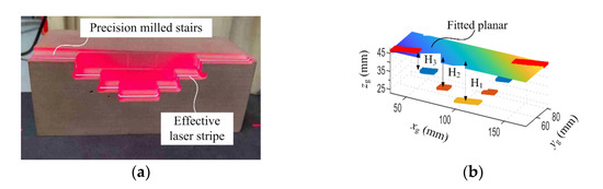 To further validate the effectiveness of the measurement system, a part with precisely milled stairs was measured, as shown in Figure 10a. The diffused laser stripe from the stairs can be seen clearly. This stripe is thin and bright, which ensures the accuracy of the results. Figure 10b is the measured point cloud and the height of each stair has been denoted by H1, H2 and H3. The fitted plane of the top stair is the reference for height computation.