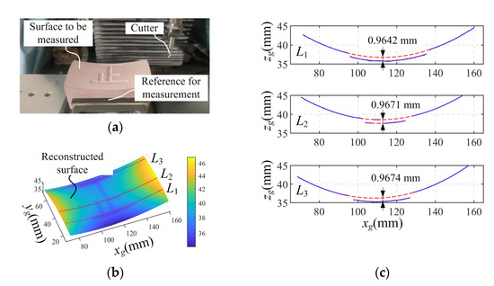 Three cross-sectional profiles, L1, L2 and L3, are selected along the xg direction on the measured surface for analysis. According to Equation (7), the profiles of the saddle surface in these three sections are all quadratic curves. Therefore, the least squares method was employed to fit the data of these profile sections. The average distance between the data points on the milled character profile and the corresponding fitted curve was calculated as the measurement value of the milling depth, as shown in Figure 11c.