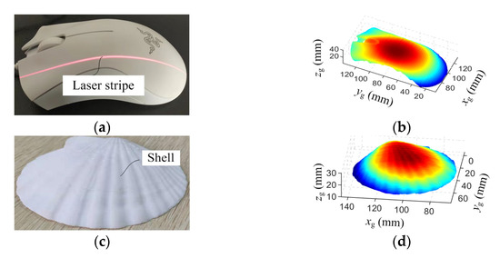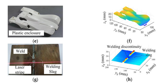 The aim of the measurement system is to obtain 3D geometrical information of the parts for quality inspection and reverse engineering. Therefore, a mouse, a natural shell, a plastic enclosure and a welded part were scanned, as shown in Figure 12a,c,e,g. With the proposed scanning system, these parts can be scanned from different angles. This makes the system more flexible and leads to a more integrated result. The measured point cloud is processed with the Delaunay triangulation method. Figure 12b,d,f,h show the triangulated surfaces.