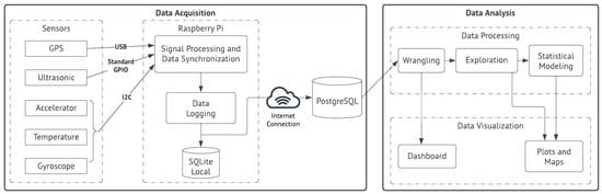 In the setup phase, libraries specific to each sensor were imported in addition to basic libraries. These specific libraries include mpu6050 and gps. The full list of libraries used for this script (data_acquisition.py) and the next one (load_postgresql.py) was made available in the project’s GitHub repository [45]. The initialization phase included defining the input and output GPIO for the ultrasonic sensors and MPU6050, the name of the log file, the types of log information, and the unit MAC address. It also included the definition of functions acquiring and processing the GPS and ultrasonic sensor data, logging all data, creating the local database connection, and defining the SQL queries used. These functions were then used in the processing and storage phases. The final output was a database file (connbike.db) with 24 features for each data point. The data acquisition script is set up to collect two records per second at temperatures specified by the manufacturers of all sensors used in BSafe-360 and in dry weather. Extreme heat or rain can reduce it to one record per second. However, it is possible to increase the sampling frequency to match the sensors’ data sampling frequency by reducing the time log variable in the script when a higher sampling rate is required. For example, one would need a higher sampling rate for the accelerometer and gyroscope data if they are interested in knowing the exact position and cycling behavior of the cyclist within the bicycle lane or when identifying irregularities in the pavement. The features and their descriptions are summarized in Table 3.