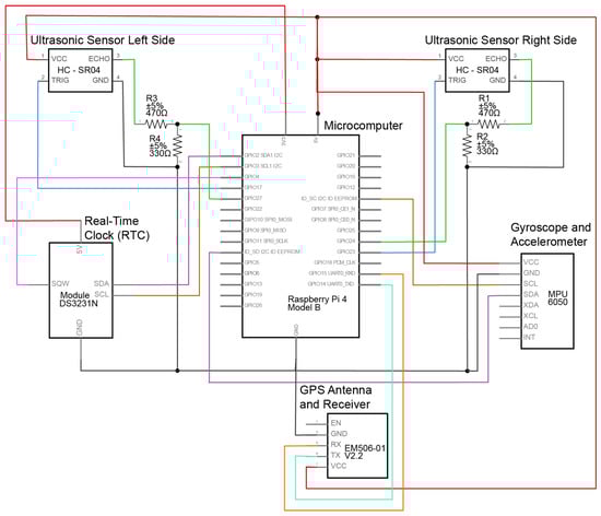 The connection between the ultrasonic sensors and the RPi is made through standard GPIO pins. Figure 2 shows the schema of the connection between the components and RPi. While these pins run at a voltage of 3.3 V, the HC-SR04 ultrasonic sensor module runs at a voltage of 5 V. Thus, resistors are added to lower the voltage. Equation (1) was used to determine the minimum resistance needed. Then, the resistance was distributed between Resistors 1 and 2 to guarantee that the input back to the sensor was recognized as high or low. The HC-SR04 module works by emitting a 40 Hz frequency ultrasonic wave from its transmitter that bounces back from obstacles within its range to the sensor’s receiver. Then, the ultrasonic sensor measures the time between the emission and reception of the waves and sends back a 5 V signal to the RPi. The HC-SR04 measurements range from 2 cm to 400 cm with an accuracy of ±3 mm. Although the measurement accuracy of the ultrasonic sensor can be affected by weather conditions, it would take severe conditions to alter the time between transmitted and received waves [42]. Data collected using BSafe-360 were for rides under mild weather conditions. Therefore, the measured distances are within the specifications of the HC-SR04 sensor.