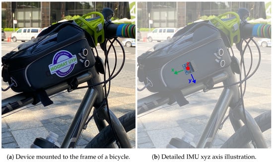 The BSafe-360 device has undergone several iterations since its first introduction by Bernardes, Kurkcu, and Ozbay (2019) [24] to achieve an easily scalable and reliable prototype. The software components were improved to bring the interval between observations from a range of 4–10 s to 0.5–1 s. The software also allows predefining an exact frequency within 0.5–1 s. The IMU unit was added to the original DAS to collect more key cycling data, and a regular phone case for bicycles replaced the 3D-printed case. We chose to alter the regular phone case instead of using a 3D-printed case because the monetary and time costs hinder the capability of having multiple units distributed to volunteers. Although 3D printing provides a custom enclosure and is the preference of other authors [23,25], the printing of one unit takes more than 10 h. whereas phone cases can be bought for cheaper when in bulk, and one unit can be adapted for fitting all sensors in less than 30 min.