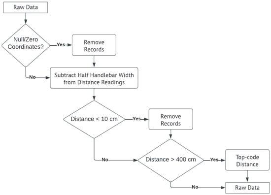 We wrangled the raw data and obtained descriptive statistics in the same script using the Pandas library. In the wrangling stage, we eliminated null and zero latitude and longitude readings, then removed duplicates. We also used mapping tools (e.g., Tableau and ArcGIS Desktop) to remove the readings not corresponding to the rides (i.e., readings at home and readings before starting and after ending a ride). Half the width of the handlebar was subtracted from the total distance from each side to account for the positioning of the device on the frame (i.e., the middle of the bicycle). Then, we removed readings below 10 cm to account for possible erroneous readings. Finally, we top-coded the distance readings from both sides to 400 cm to account for the range of the ultrasonic sensor module. Any reading greater than 400 cm was interpreted as not a lateral obstacle of interest near the bicycle. Figure 4 summarizes the wrangling process described as a flowchart. The cleaned data can then be utilized for assessing bicycle safety through static or dynamic visualizations or more in-depth statistical analysis and modeling, as presented in Bernardes et al. (2023) [46].