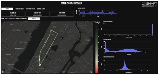This study also allowed us to identify limitations of BSafe-360 that should be further researched. The device relies on ultrasonic sensors to collect LPDs, which may not be accurate under all conditions. For example, sensors may not accurately record distances in heavy rain, snow, or situations with a lot of background noise. This sensitivity to weather is also true for the GPS sensor. It presented inconsistency in the data under the rain, as observed in Figure 9. Additionally, the accuracy of the GPS can be affected by urban canyons, as observed in some parts of the route surrounded by tall buildings. The GPS limitations can be addressed by applying the Kalman Filter or Dead-Reckoning methods to predict the exact trajectory in real-time. The position of the IMU at a slight angle resulted in a 3.4 m/s offset from zero for the acceleration readings in the x-direction. Therefore, we suggest that further calibration must be performed for future studies to take into account the angle of the bicycle frame in relation to the pavement.