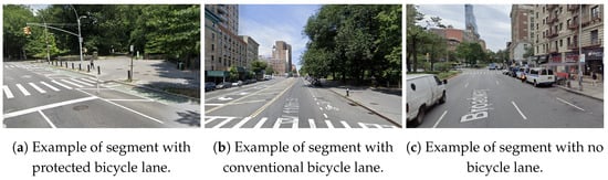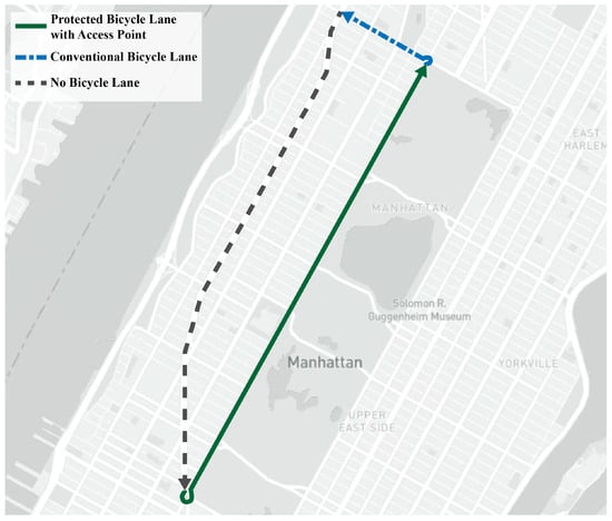 The selected route was 9.5 km long and was located in a mixed land use area in Manhattan, NYC (Figure 7). The area in which the route is located is known for heavy bicycle traffic, as the median percentage of people who ride a bicycle to work per census tract is 2.30%, which is higher than the percentage of people who ride a bicycle to work when considering the whole city (1.36%) [47].