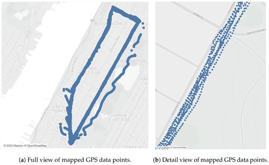The GPS data points were plotted using Tableau (Figure 9). When in a larger zoom, the accumulated points look like lines because of the small interval of up to one second between them. Although the precision of the GPS is 2.5 m, and the route is in an urban canyon, the data points properly matched the segments and intersections of the route, as confirmed by CCTV video footage. Data points far from matching the route were collected in rainy weather.