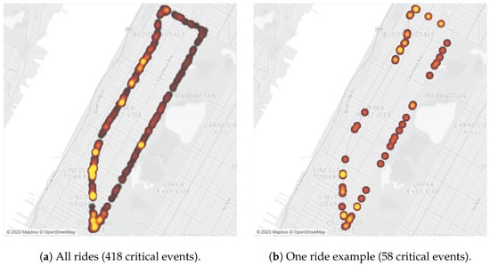 After removing the data points that could not be visually matched to the route, we had 6 h, 4 min, and 14 s of data. The 23,959 data points resulted in 919 points with LPD of less than 100 cm and 418 critical events. Figure 10 shows heatmaps of the critical events observed for all rides and for a sample ride, which allows hotspot identification. We observed an average of 46 critical events per loop completed of the ride (s.t.d. = 27, min = 8, max = 88). As expected, due to them composing most of the route, non-existing infrastructure and protected bicycle lanes observed 56.70% and 33.89% of the data points, respectively. The conventional infrastructure portion of the route observed 7.09% of the data points, and the shared infrastructure portion observed 2.32%. A similar pattern was observed when looking into the critical events data. The portion of the route with non-existing infrastructure observed 54.07% critical events, the portion with protected bicycle lanes observed 38.76%, the portion with conventional bicycle lanes observed 6.22%, and the portion with shared bicycle lanes observed 0.96%.