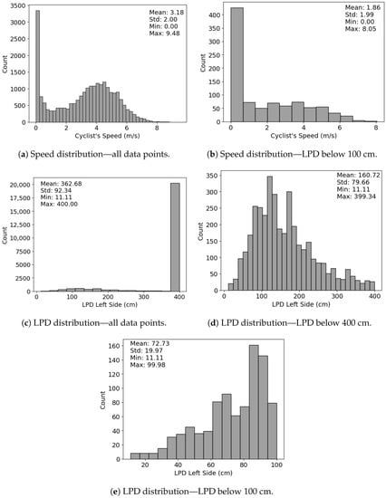 In bicycle safety studies, the LPD is defined as the distance between the bicycle and passing vehicles, and each vehicle that passes on the side of the cyclist is defined as a passing event. BSafe-360 is capable of collecting LPDs of passing events through ultrasonic sensors. For each passing event, the device registers one or more LPD readings, depending on how long the vehicle stays on the side of the bicycle. For example, if a speeding vehicle passes the cyclist, the device will record only one LPD reading for the passing event, whereas in the case where both the cyclist and the vehicle are slowly stopping as they approach an intersection, more than one LPD reading will correspond to the passing event. In this case study, we considered only readings from the ultrasonic sensor to the left side of the bicycle to be LPDs corresponding to passing events because that is the side on which the motor–vehicle traffic circulates. We also defined that only readings below 400 cm could indicate a possible passing event.