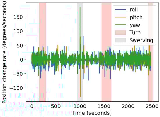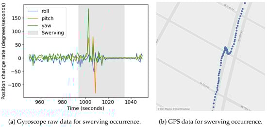 Gyroscope (a) and GPS (b) data for swerving occurrence.
