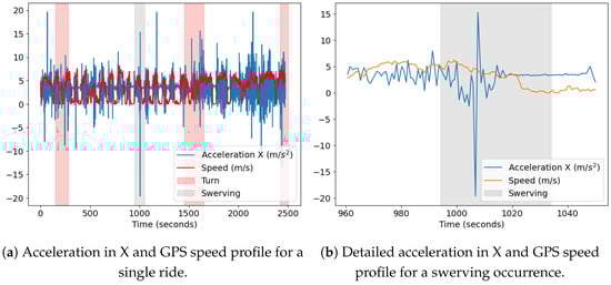 Acceleration in X and GPS speed profiles for one sample ride (a) and a detailed view for the same data profile for swerving occurrence (b).