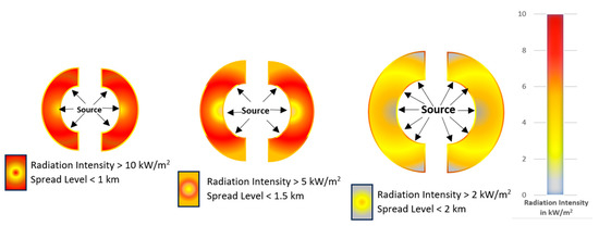 Fires involving chemicals and subsequent explosions are very common, as well as the most significant type of industrial accident. Any leakage in the container allows the hazardous and flammable chemicals to mix with external oxygen and, upon reaching the critical mass for ignition, an exothermic oxidation reaction takes place, resulting in fire. Though many precautionary measures are already implemented inside industry premises, the major concern is accidents during the external transport of hazardous or flammable substances [1,2]. The transportation of flammable chemicals is an integral part of industrial activities; flammable substances like petroleum products are largely transported by tankers via roads or railways. As per the statistics from the United Nations, 50% of all industrially transported goods fall under the category of dangerous goods [3]. An accident occurring during the external transport of flammable substances can lead to catastrophic consequences, causing huge losses of life and property [4]. Mechanical faults present in the system, such as damaged couplings and hoses used for loading and unloading LPG on and off tanker trucks, are a major source of fire accidents [5]. The overturning or collision of an LPG-filled tanker vehicle leads to leakage of the flammable substance and subsequent vapor-cloud formation, fire, and, finally, a fireball, causing devastation [6]. The extent of damage caused in the surrounding area, which includes fatalities, injuries with first- and second-degree burns, and severe to moderate damage to property, is directly related to amount of generated heat flux and pressure [7,8]. In such cases, the appropriate action with the least possible delay is the key to minimizing subsequent losses. The leakage of gas or liquid, if not attended to, may lead to fire and explosion within a very short time span. The remedial action may vary from the restoration of the leakage to optimizing resource mobilization to a mass or controlled evacuation, depending on the situation [9]. However, the decision-making mechanism remains unable to evaluate the accident occurrence, the location of the accident site, and its extent within the critical timeframe.