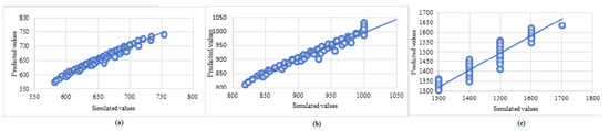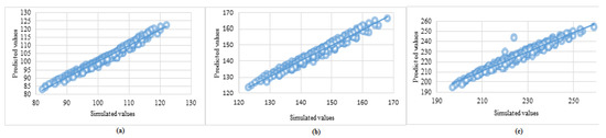 Regression plot, i.e., predicted vs. simulated values (in meters) of diameters of risk contour for consequences with heat flux (a) (b) , and (c) .