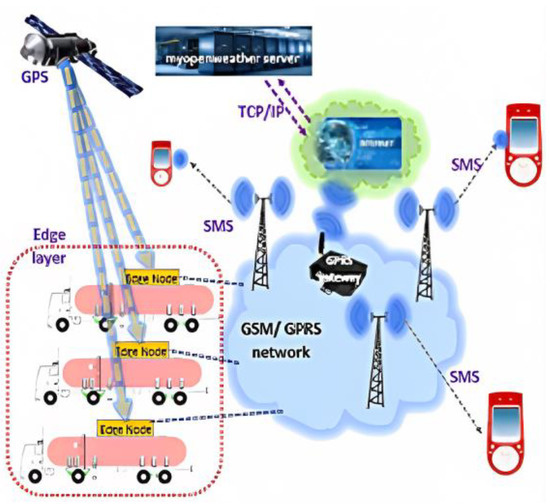 The proposed IoT framework, shown in Figure 5, has two functional layers, namely, the edge layer and the network layer. The edge layer comprises edge nodes as its basic building blocks. The edge nodes are the on-board devices installed in each tanker truck availing of the proposed service. The geographically sparsely located edge nodes are connected to the components of the network layer via a wireless link. As the tanker truck moves remotely down the highways, the proposed solution uses the cellular network to establish a communication bridge between the edge layer and the network layer. In this proposed work, the GSM/GPRS network was chosen due to its widest coverage range. The volume of data exchange happening in this application is well within the capacity of the GSM/GPRS network.