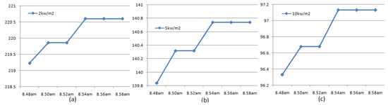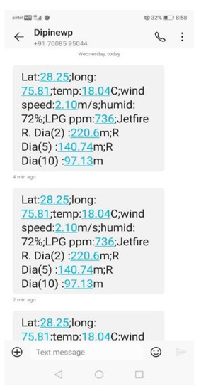 The device was powered by a 9-volt battery. To test the performance of the proposed device, LPG gas was intentionally leaked from the gauge/pressure valve following the guidelines of IOCL and instructions from the safety officials at the plant. The attached device started working as instructed in the pseudo-code given in Table 7. The device was triggered and detected leakage when the measured ppm level of LPG exceeded the predefined threshold. Then, it fetched the location information from the GPS, which including the latitude and longitude of the experimental location. The latitude and longitude values were sent to the MyOpenWeather server to fetch the required real-time weather information for the location, i.e., ambient temperature, wind speed, and humidity. Finally, using the predefined model represented in Equation (6), the risk contour diameters were evaluated. With the help of GSM AT commands, the information generated in this process was sent to latitude and longitude in the form of SMS. The information includes: (i) latitude and longitude of the location; (ii) ambient temperature; (iii) wind speed; (iv) humidity; (v) ppm level of LPG; (vi) expected consequence (jet-fire or fire ball); and (vi) diameter of risk contours with heat intensities of 2, 5, and 10 kw/m2. The SMS was set to generate periodically with an interval of 120 s. The screen shots of the registered mobile containing a few samples of received SMSs are shown in Figure 8. The test was conducted for nearly 15 min. Figure 9 shows the detected results over time. The predicted values in the SMS were validated with the simulated values and were found to be in close agreement. As this test involves high fire and life risks, the device was not tested with fire.