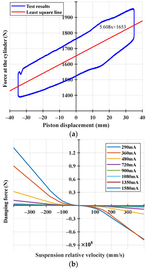 Semi-active suspension characteristics: (a) stiffness characteristics and (b) damping characteristics with respect to the applied valve current.