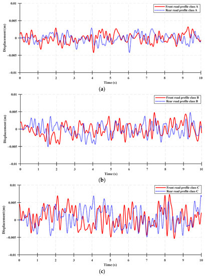 In this simulation, the road profiles from Classes A–C were used for the road excitation of the front tire. For the rear tire, the same profile class as that of the corresponding front tire was used with a certain time delay , which can be expressed as follows: