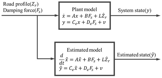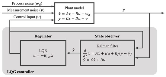 (2) An accuracy index was defined to validate the performance of the Kalman-filter-based state observer of the designed LQG controller. The designed state observer was validated under different road profiles (ISO 8608 standard classes) in simulations and was confirmed as acceptable to use for the state feedback of LQR control.
