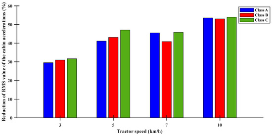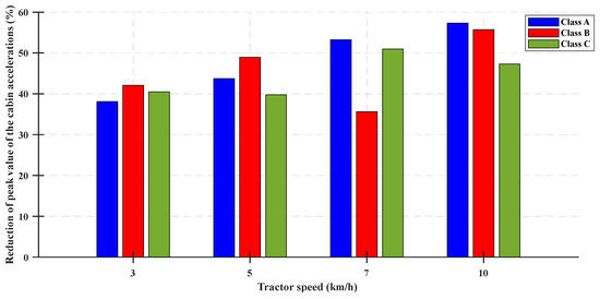 The performance of the designed control algorithm was examined by conducting a parametric study in Figure 14 and Figure 15. The decreases in the peak and RMS values of the cabin acceleration were evaluated with respect to different tractor working speeds in the range 3–10 km/h under the ISO standard profile condition. The decrease in peak acceleration of the cabin was in the range 35.64–57.34%, and the decrease in the RMS value of acceleration was in the range 30.98–53.95% under the tractor working conditions.