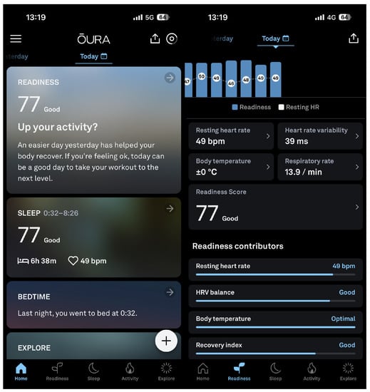 It takes two weeks for the Oura ring to build a comprehensive blueprint of the user’s physiology. This includes the user’s typical sleep rhythm, their normal heart rate, and their average body temperature (Figure 1). Once it has gathered enough information about its user, consistent adherence to wearing the ring is necessary for Oura to maintain its understanding of the wearer in order to report accurate readiness and sleep scores (Figure 1) (https://ouraring.com/blog/readiness-score/ (accessed on 15 March 2023)). The ring should be worn throughout the day with the exception of short tasks in which keeping the device on might be uncomfortable (e.g., weightlifting) (https://support.ouraring.com/hc/en-us/articles/4408961184147-General-FAQs (accessed on 15 March 2023)). Wearing the ring right before sleeping, all throughout the night, and in the daytime upon waking is also vital to ensure that the device captures the user’s sleep stages accurately. To sync their data, the user must access the Oura application on their mobile phone; the ring can store up to a week’s worth of data without syncing, so it is recommended that app syncing be performed on a regular basis. The ring is only charged when it alerts to having a low battery percentage (the ring’s battery lasts for several days, so this should happen every 4–7 days).
