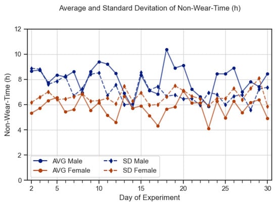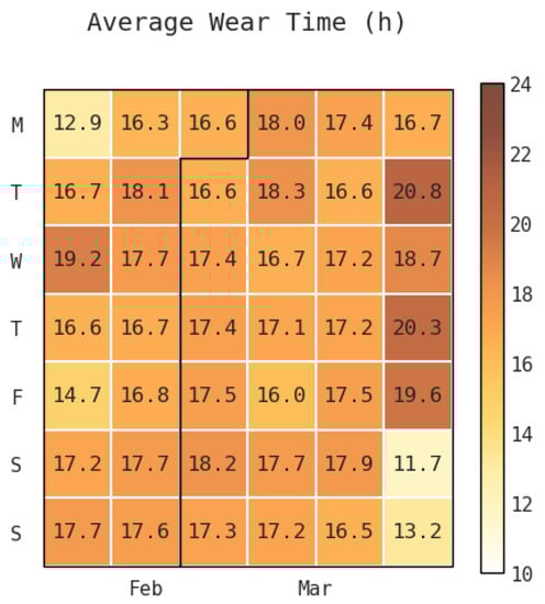 Starting from day 2 of the experiment, the daily average wear time across all participants did not fall below 12 h: Daily average wear times typically ranged between 15 and 19 h with very little variation (SD = 1.7) (Figure 2). The values did not deviate respective to the day of the week and remained relatively consistent throughout the 30-day experiment duration. However, the daily median wear time for all participants per experiment day was noticeably higher than the daily average: The values ranged from 18–21 with the exception of two days where the median was 16.3 and 17.6 (SD = 2.2). This indicates that most users have higher actual daily wear times and the average is being brought down by outliers.