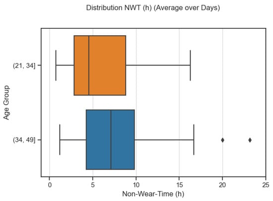 Women appeared to wear their rings more consistently over longer periods compared to men: their average daily NWT was 5.64 h (SD = 6.32) while men averaged 7.75 h of NWT a day (SD = 6.96) (Figure 3). Meanwhile, younger participants (21–34) had a mean NWT of 5.39 (SD = 5.34) while older individuals (35–49) had a mean NWT of 8 (SD = 7.71). Despite this contrast between age brackets, the interquartile range between the two groups almost fully aligns, meaning the spread of values are almost the same for both groups (Figure 4).