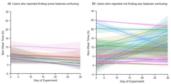 The difference in usage trends between users who reported finding features of the Oura ring confusing and users who did not. (a) The non-wear time trends of users who reported some features of the Oura ring confusing. (b) The non-wear time trends of users who declared they were not confused by any of Oura’s features.