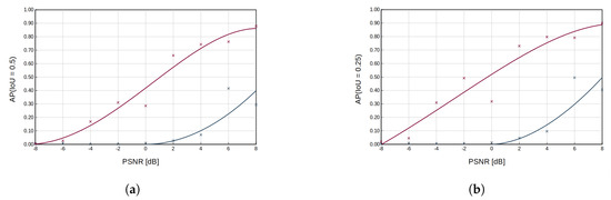 Figure 5 shows the detection results of bounding boxes for ED and RFROI-CNN. The first row of spectrogram in Figure 5a,b is a radio spectrogram from the test set. The second one is a visualization of a reference bounding box used in mAP computation, created on the parameters of the generated signal. The third row shows graphically plotted signal detection using the ED detector, while the fourth row shows the graphically plotted signal detection using RFROI-CNN. The colors of the bounding boxes are dependent on the center frequency of a detected signal. A summary of the results for the different datasets is shown in Table 1, while the obtained mAP versus PSNR dependencies for IoU threshold for fixed carrier power modulations is shown in Figure 6, and for single-band modulations in Figure 7.