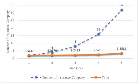 The number of bidders participating in an auction process significantly influences the operational speed of the overall system. The presence of a larger pool of bidders leads to an increased number of bidding rounds, complexity of the hash function, and a subsequent expansion of the auction’s scale. In the scope of this experimental investigation, as shown in Figure 4, we aim to empirically validate the operational efficiency of the proposed elliptic curve cryptography-based first-price sealed-bid auction algorithm on a blockchain platform, particularly when confronted with a scenario involving multiple insurance companies and an augmented number of stakeholders in the system.