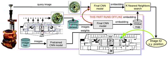 Place recognition begins by loading the learned CNN model and index of images (map) into memory, and then the captured images (queries) are compared with the previously created image database using the KNN algorithm in the space of embedding vectors. The embeddings are compared using L2 (Euclidean) distance, which has been shown to be more computationally efficient than feature binarization followed by the comparison applying Hamming distance [36,54].