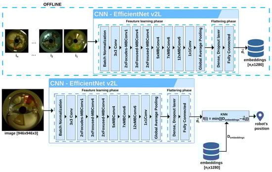 CNN and KNN are both machine learning techniques, but differ in their approach and application. CNN learns hierarchical representations of data through multiple convolutional layers, pooling, and fully connected layers. In contrast, KNN is a simple and intuitive algorithm for classification and regression tasks. It makes predictions based on the similarity of new data points to the existing labelled data points in the feature space. One can use CNN to extract features from images and then apply KNN to those extracted features for classification. This hybrid approach leverages the strengths of both algorithms, with CNN capturing intricate patterns and KNN using the extracted features for classification [46]. This idea is used in our localization system. The backbone CNN creates descriptors, which hereinafter are also called “embeddings”, directly from the omnidirectional images, avoiding the additional computations required to obtain undistorted panoramic images. The KNN algorithm uses the embeddings that encode the most salient features of the observed places, to find in the database (i.e., the global map) the images that best match the current observation. In Section 4, we demonstrate that the accuracy of localization with raw catadioptric images is at least as good as with the converted panoramic images, while it demands less computing power.