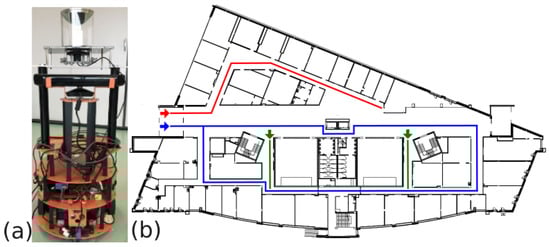 A Labbot robot (Figure 3a) with an integrated catadioptric vision sensor was used in the first scenario. The catadioptric camera in this sensor consists of a Microsoft LifeCam and a hyperbolic mirror, which provides a field of view of 360 and produces images with a resolution of 640 × 480. The images are processed by a Nvidia Jetson TX2 computer integrated with the sensor [8] The Jetson TX2 offers a 256-core Pascal architecture General Purpose Graphics Processing Unit (GPGPU) to support the real-time operation of the localization system.