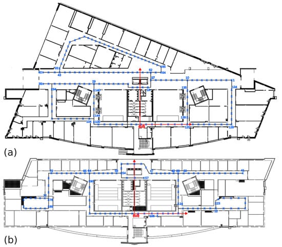 Blueprint of the first floor (a) and third floor (b) of the Mechatronics Centre building, with marked places (blue crosses) where images were taken.