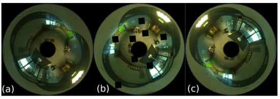 Example of omnidirectional image augmentation: (a)—original picture; (b,c)—augmented images.